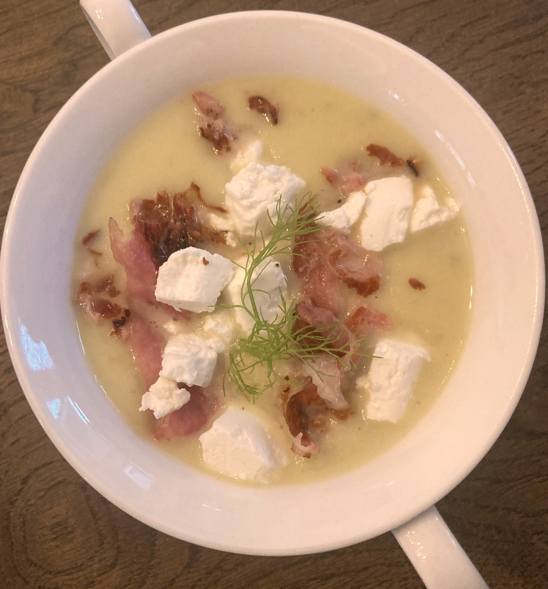 Verdeel de soep over de kommen en garneer met de geitenkaas, spek en venkelgroen.